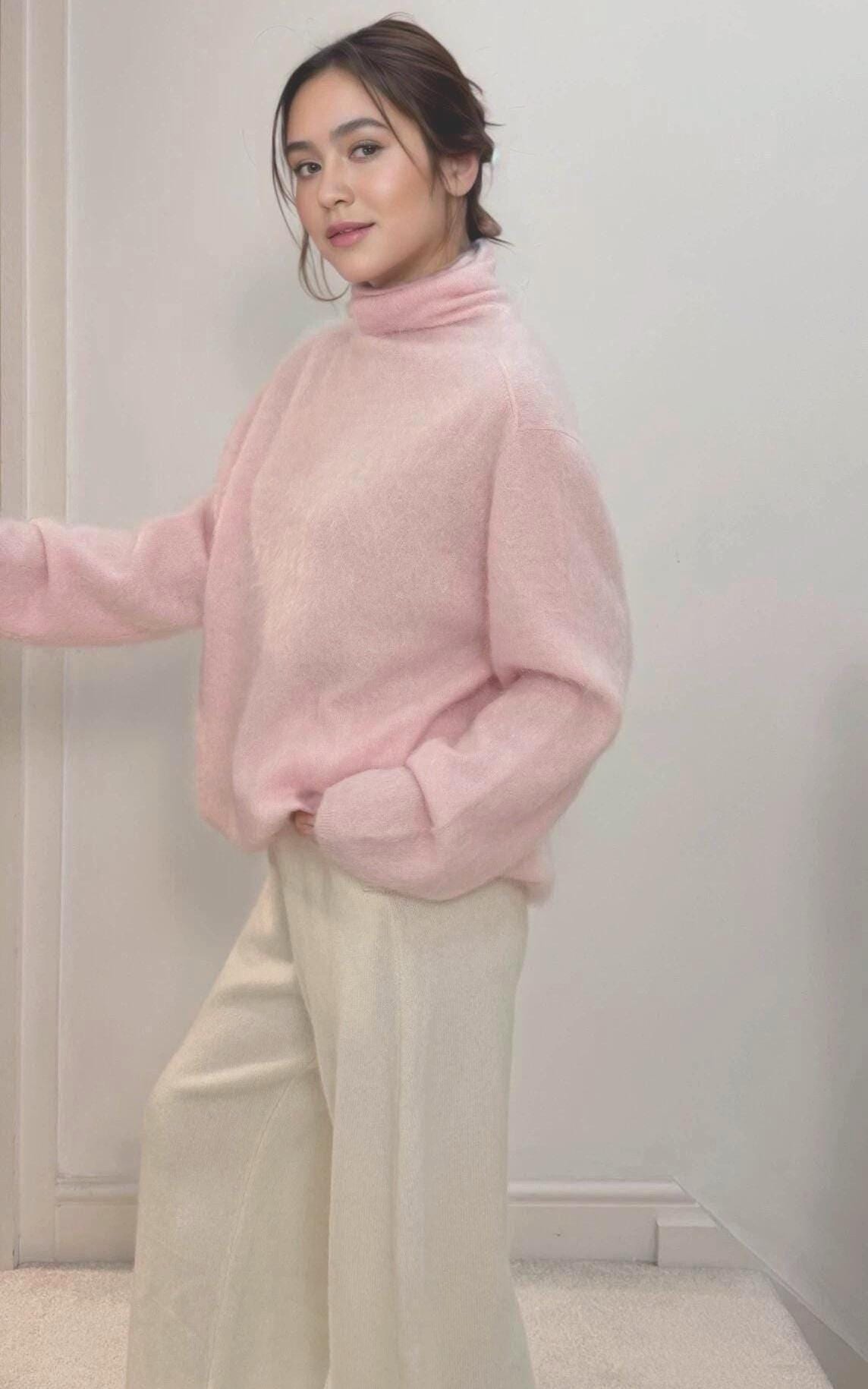 Rendered in a delicate Cherry Blossom Pink, this brushed cashmere turtleneck sweater evokes softness and quiet elegance. Gently brushed for a cloud-like texture, it drapes effortlessly over the body with a relaxed silhouette and subtly voluminous sleeves. The refined turtleneck adds warmth without weight, making it an ideal piece for serene, cozy moments and elevated everyday wear. A timeless expression of softness, femininity, and modern luxury.