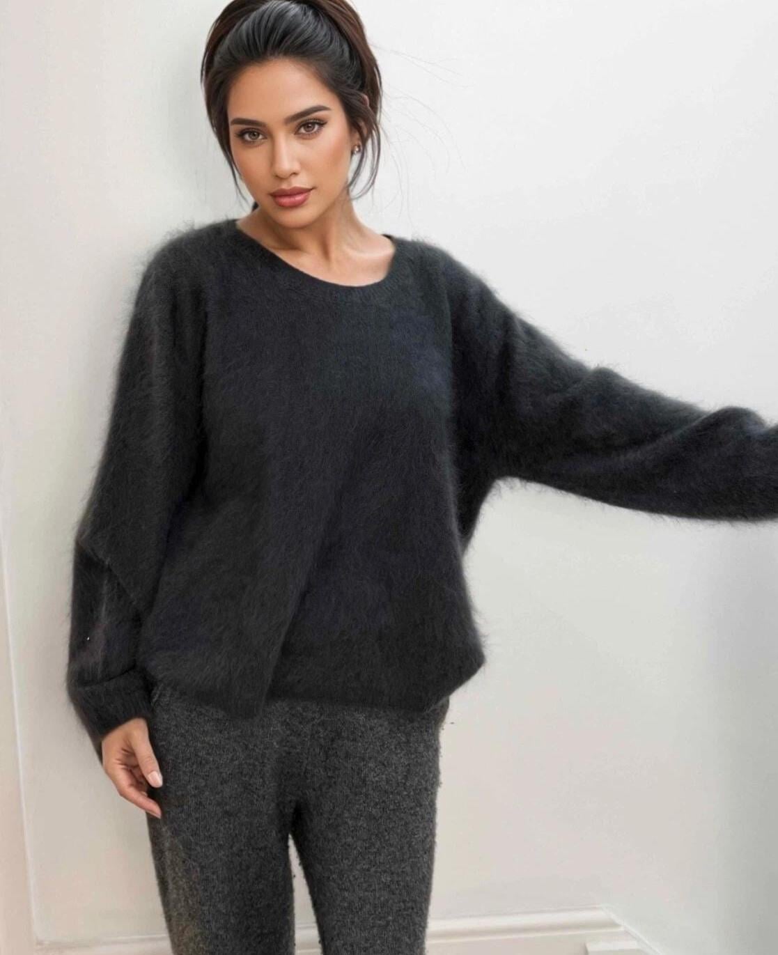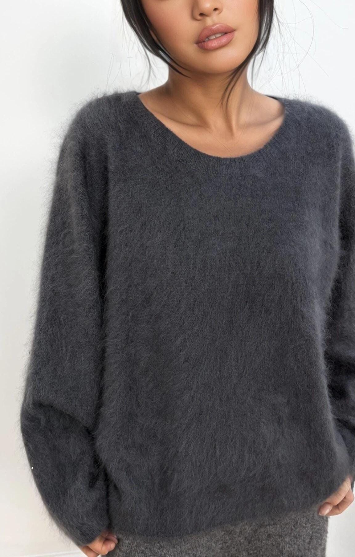 A luxuriously soft cashmere–wool blend sweater crafted with a plush, brushed finish for an exceptionally cozy feel. This relaxed piece features a classic crew neckline, long sleeves, and gentle drop-shoulder seams that create an effortless drape. The fluffy texture highlights the premium natural fibers, offering warmth without weight. Its muted taupe tone adds timeless versatility, making it an ideal choice for elevated everyday wear and cool-weather lounging.