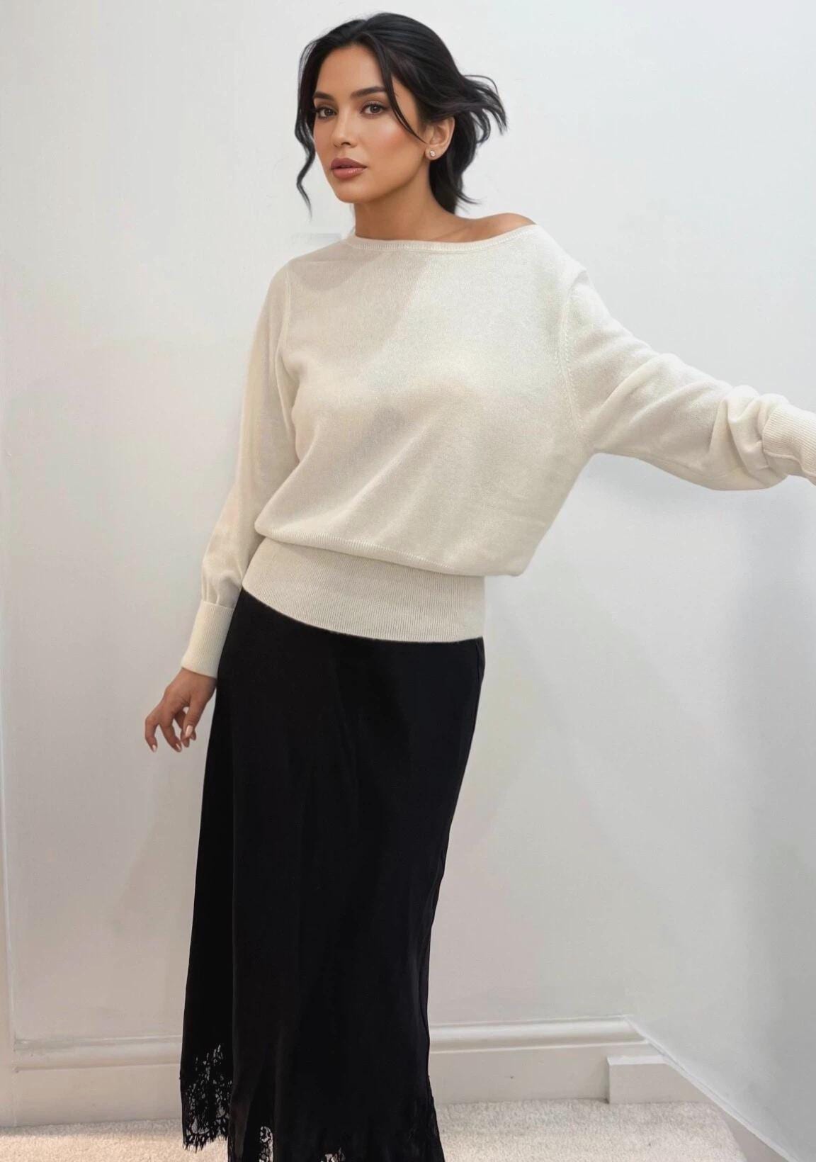 Luxurious Off-the-Shoulder Cashmere & Wool Blend Sweater – Timeless Elegance & Cozy Comfort